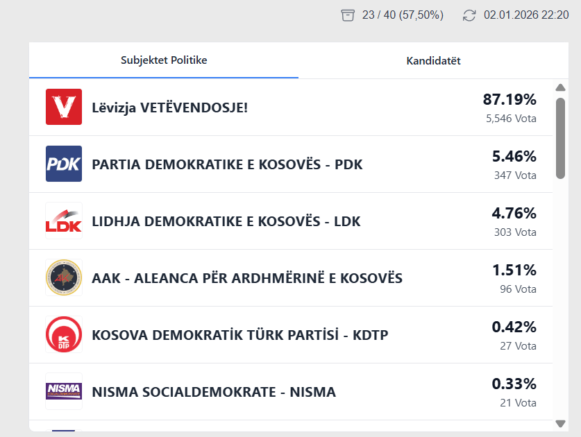 Sipas KQZ-së, deri më tani janë procesuar 23 nga 40 vendvotime, që përbëjnë 57.50 për qind të totalit. Të dhënat janë publikuar më 2 janar 2026.