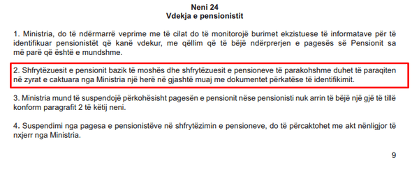 “Përfituesit e pensionit bazik të moshës dhe atij të parakohshëm janë të detyruar të paraqiten në zyrat e caktuara çdo gjashtë muaj, duke pasur me vete dokumentacionin e identifikimit”, saktëson neni 24.
